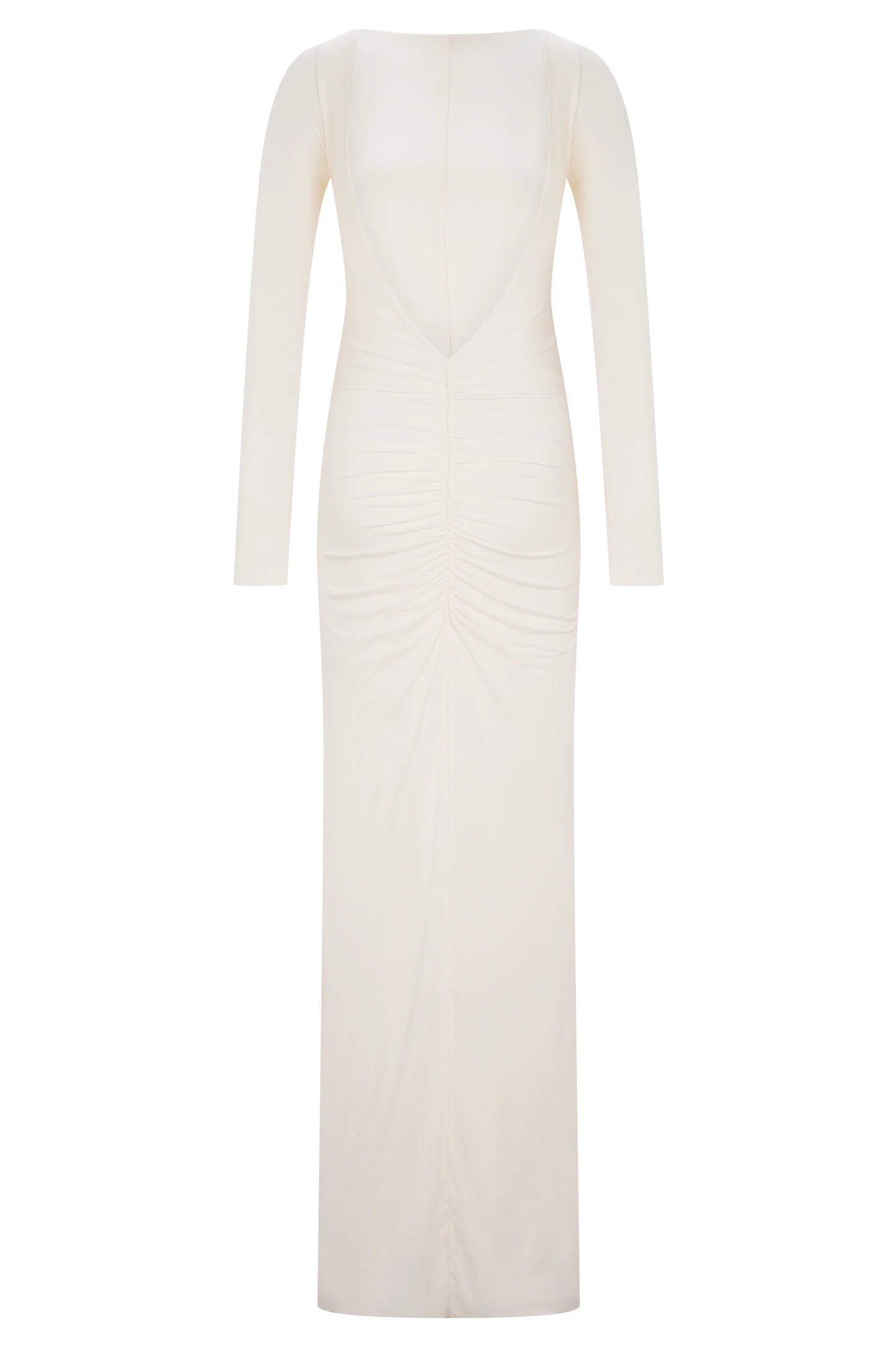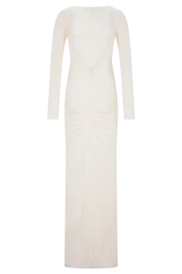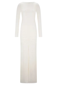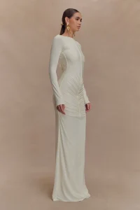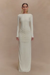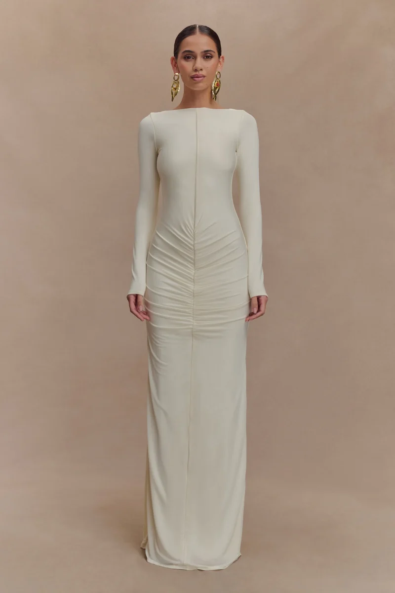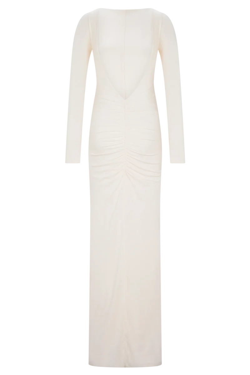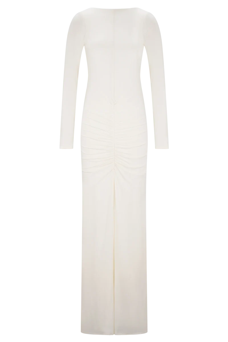 El vestido largo ajustado de manga larga LOUISA es una elegante declaración de minimalismo moderno. Diseñado con un elegante escote barco y una espectacular espalda en V, este modelo totalmente forrado se adapta al cuerpo con una silueta elegante y ajustada. Las mangas largas y los detalles fruncidos en los hombros añaden un volumen suave, mientras que el fruncido en la cadera aporta una textura y un movimiento sutiles. Con un largo maxi que roza el suelo, este vestido está pensado para esas veladas que requieren un dramatismo discreto y una sofisticación natural.